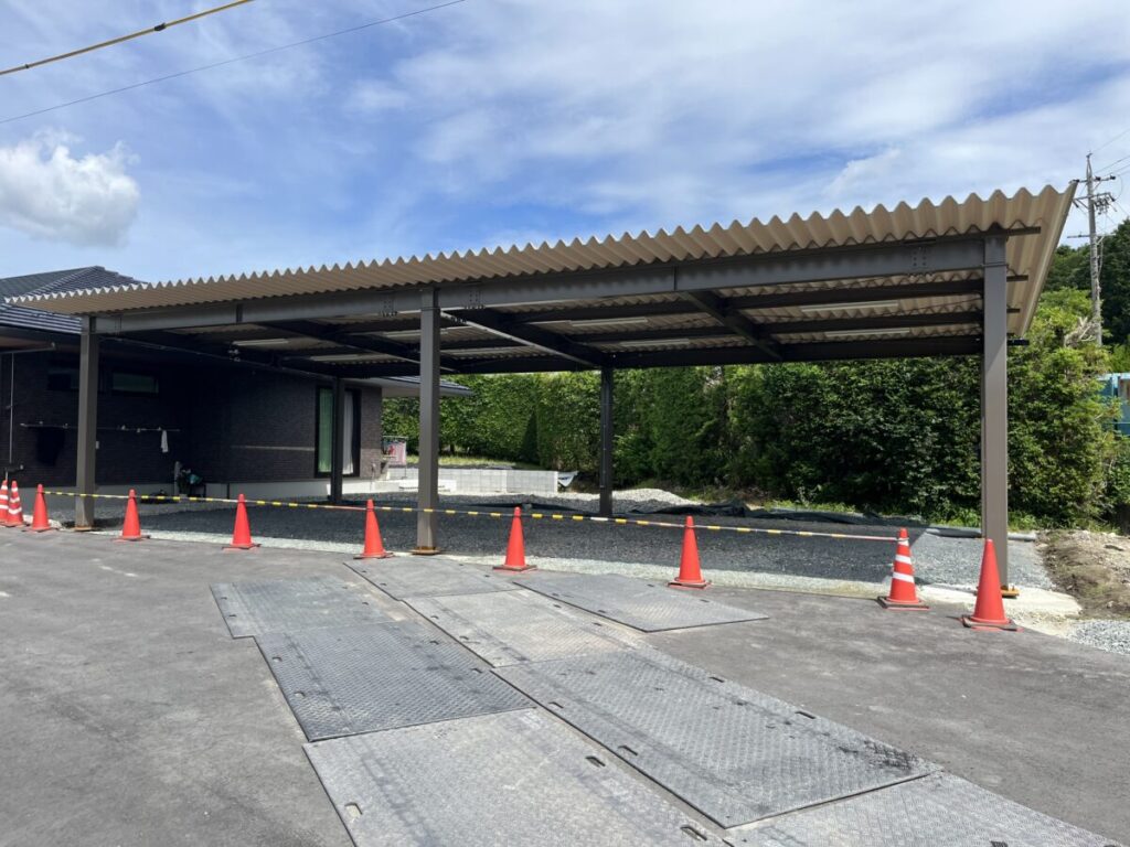 新城市:ガレージ屋根に太陽光発電が安心して積載できる重量鉄骨ガレージ