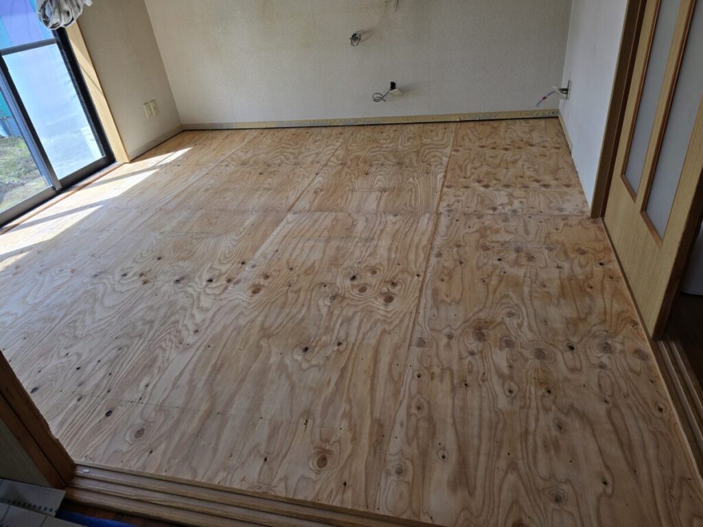 リビング客間、リビングとして使用する場所が経年劣化した畳だったので、愛猫ちゃんも安心して過ごすことが出来るフローリングに模様替え