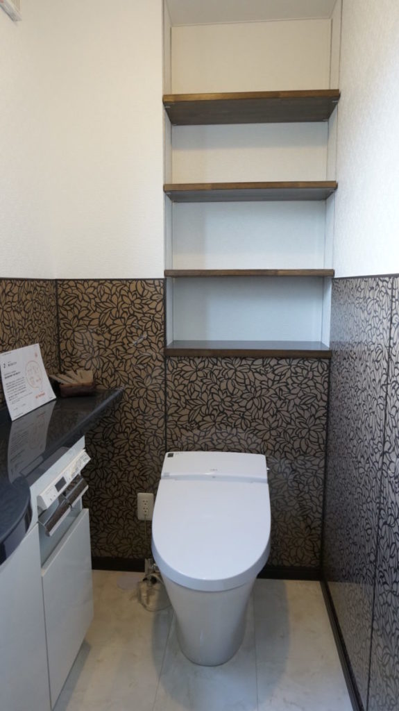トイレトイレの壁にはお手入れ簡単で、抗菌に優れているセラールを貼ってあります。衛生的に使える自動水栓付カウンターにしました。